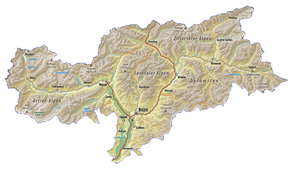 Südtirol amtlich: "Autonome Provinz Bozen – Südtirol", ist die nördlichste Provinz Italiens und bildet zusammen mit der Provinz Trient die autonome Region Trentino-Südtirol. Seit Inkrafttreten der erweiterten Autonomie im Jahr 1972 genießt Südtirol umfassende Selbstverwaltungsrechte und wird entsprechend als "autonome Provinz" oder "Land" bezeichnet. Das mitten in den Alpen gelegene Gebiet hat rund 530.000 Einwohner, seine Landeshauptstadt ist Bozen. Südtirol zählt zu jenen Gebieten Italiens mit einer starken Regionalkultur. |